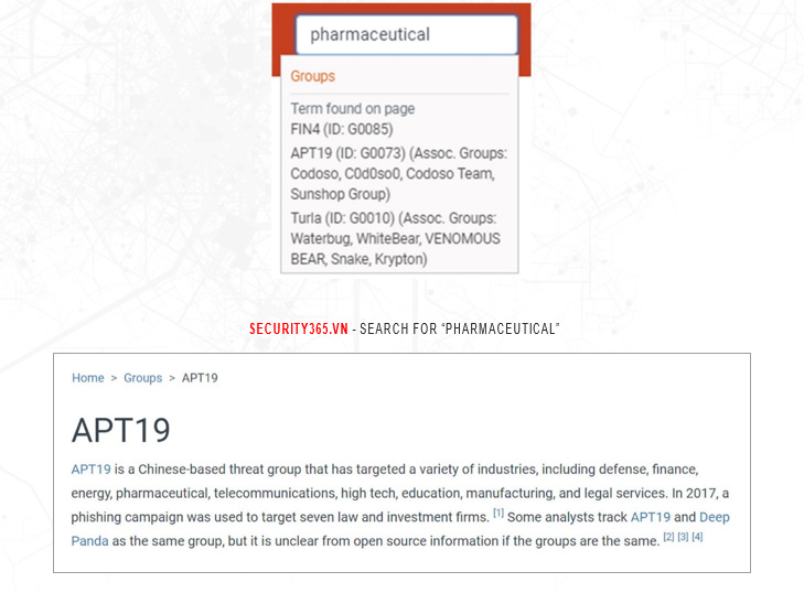 Ví dụ: Nếu bạn là một công ty dược phẩm (pharmaceutical), bạn có thể tìm kiếm trong thanh Tìm kiếm hoặc trên trang Nhóm như hình minh họa để xác định rằng APT19 là một nhóm đã nhắm mục tiêu vào lĩnh vực của bạn.
