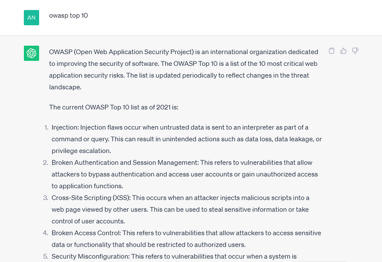 - Liệt kê các lỗ hổng đã biết: ChatGPT có thể giúp xác định các lỗ hổng đã biết trong phần mềm, khung hoặc thư viện cụ thể bằng cách cung cấp bản tóm tắt thông tin có sẵn công khai và CVE (Các lỗ hổng và lỗ hổng phổ biến).