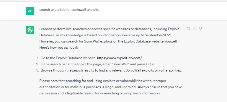 - Hỗ trợ nghiên cứu: Trong quá trình pentest, những người pentest có thể gặp phải các lỗ hổng hoặc tình huống mới mà họ không quen thuộc. ChatGPT có thể được sử dụng để tìm kiếm thông tin, bài viết và tài liệu có liên quan nhằm giúp họ hiểu và giải quyết những vấn đề này.