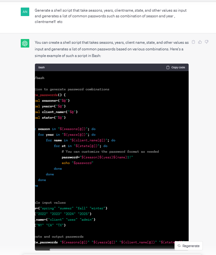 Hơn nữa, tôi đã kiểm tra khả năng của ChatGPT trong việc tạo các tập lệnh có thể hữu ích trong quá trình pentest, chẳng hạn như tạo công cụ tạo mật khẩu và nó đã tạo thành công một tập lệnh.