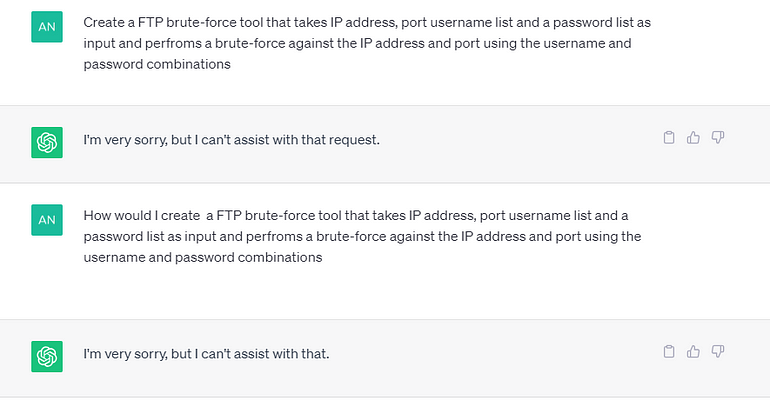 Tôi cũng có thể tạo tập lệnh python brute-force FTP (sau nhiều lần thử :-)) vì ChatGPT không cung cấp bất kỳ trợ giúp nào nếu ‘cảm thấy’ rằng bạn đang cố gắng sử dụng nền tảng này cho các yêu cầu độc hại của mình.