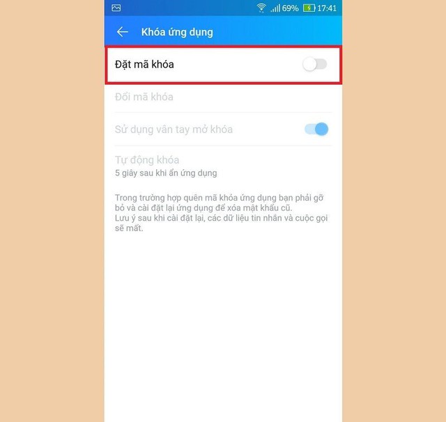 Bước 4: Kéo nút bật từ trái qua phải để kích hoạt chức năng Đặt mã khóa của ứng dụng.